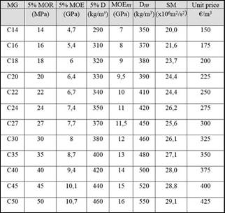 European rules for structural timber, NF EN-338 (2016), NF EN-384 (2016) are based on characteristic values (5-percentile) for MOR, MOE and density that must be determined by experimental tests on at least 900 timber pieces. Classes named C14-C50, based on the 5-percentile MOR (14 MPa-50 MPa) give references for both characteristic (5-percentile) and mean values for MOE and density (Table 5). The values for specific modulus (SM = MOE/D) and a tentative estimation of prices for each grade are added in Table 5.