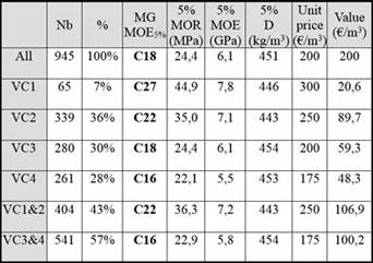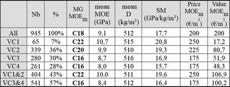 Class by class (or grouping 2 classes), grading using mean MOE is more severe than grading using characteristic MOE values. Characteristic or mean density is always far above established references. Using grouped visual graded classes gives around 43% C22 (VG1 and VG2) together with 57% C16 (VG3 and VG4), with a mean putative value of 207 €/m3 which means only 3,5% more than without difference among visually graded populations. The significance of this result remains to be determined.