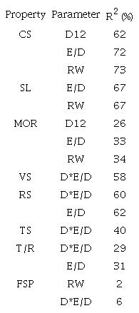 The different properties were predicted by stepwise linear regression. The combined influence of density and specific modulus can be additive or multiplicative (as for MOE) as a result, the product between these two parameters was introduced as an option in the analysis.