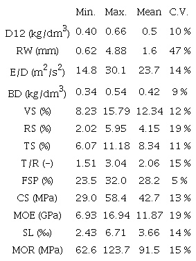 Variability in compressive strength was the lowest among mechanical properties, while MOE variability was significantly higher (19%). All mechanical properties were in the usual range for pines (Kretschmann 2010).