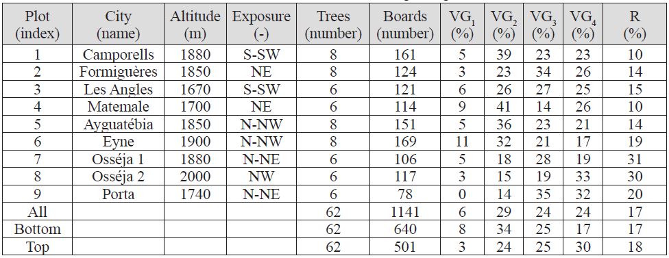 All 2 m long samples were graded using the French standard NF B 52-001-1 2011 employing four classes for visual grading (VG1 to VG4) based on combined criteria like ring width, knot diameter, position, splits, warp, rot etc. Boards that do not fulfil these criteria for any reason are rejected (R). Table 1 describes the differences in visual grading both for each plot and between bottom and top logs. Only the graded boards (945 in total) were used for the measurement of density and mechanical properties.