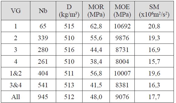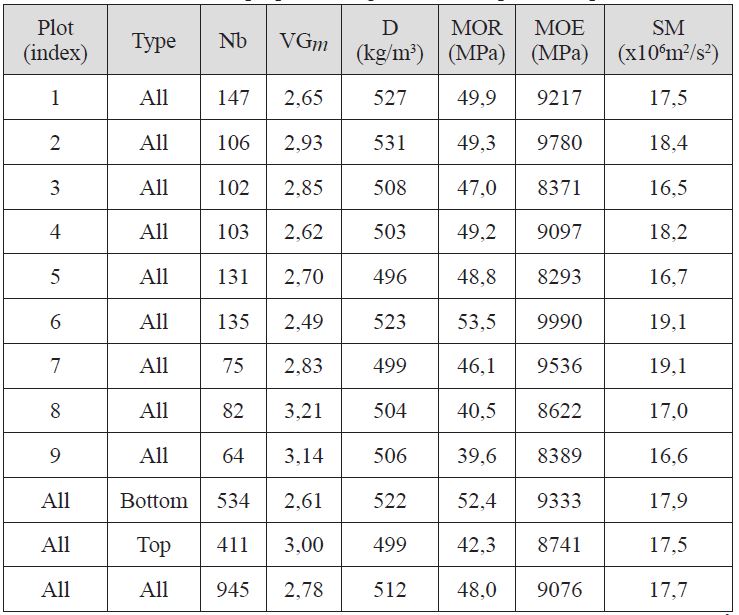 At plot level (Table 2), VGm is the mean value of visual notation (from 1 to 4), low values signifying better classification for the plot. There is consistent concordance between this mean visual classification and the mean strength (MOR) for the different plots, but this is not the case for mean density or mean stiffness of the boards (Table 3). The same concordance occurs between bottom and top logs: a 15% reduction in mean visual class (VGm ) leads to a 20% reduction for mean MOR but only 6% for MOE, 4% for D and 2% for SM.