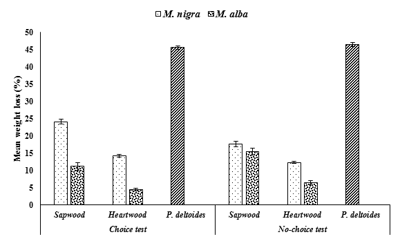 In previous studies, choice and no- choice tests were used to examine the preference of wood by termites and for determination of resistance (Morales-Ramos and Rojas 2001). In our study, heartwood of both mulberry species tested showed higher resistance to termites compared to sapwood of the same species. This is not surprising, in that sapwood is generally softer and has lower amounts of toxic compounds compared to heartwoods. Sapwood also has higher level of starch and sugars that may be attractive to termites (Kasseney et al. 2011, Rasib and Ashraf 2014). In our study, termites in the choice test avoided the heartwood of M. alba compared to M. nigra. This is in agreement with Rasib, (2008) who showed that M. alba was not palatable to Microcerotermes championi under choice and no-choice tests. In our no-choice tests the mass loss of M. alba was significantly less compared to M. nigra. Sapwood of the positive control, P. deltoides was the most preferred wood species as H. indicola workers consumed much higher amounts of this wood.