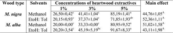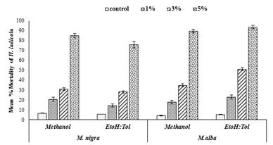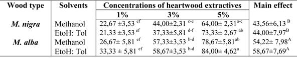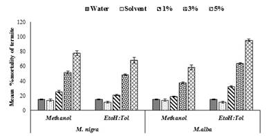 Toxicity of extractives as termite mortality showed increasing toxicity with increasing extractive concentration (Figure 2) All mortalities incurred by the three concentrations of extractive treatments were found to be significantly different from each other (p<0,05). A maximum mortality of 95,5 % was observed for termites that were fed on filter paper with the maximum (5 %) concentration of M. alba extractives in ethanol: toluene, followed 77 % mortality of M. nigra in methanol. Highest concentration of heartwood extractives from M. alba caused significantly high mortality compared to extractives of M. nigra. However, methanol extracted M. nigra specimens were more toxic to H. indicola compared to M. nigra extractives in ethanol: toluene (Figure 2).