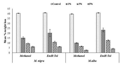 The mean percent weight loss of treated and non -treated P. deltoides exposed to H. indicola is shown in Figure 3. Solvent only treated P. deltoides controls showed 39 to 40 % weight loss. Conversely, P. deltoides treated with both types of mulberry extractives showed significantly less weight loss (2,69-6,23 %) at the highest 5,0 % concentration. Whereas, the lower concentrations did not incur as high a rate of damage. The weight loss was found to be inversely related to extractive concentration. Extractives of either Morus species at every concentration tested was toxic compared to the solvent only treated controls (Figure 4). Mortality of H. indicola was greater than 875 % in the highest concentration tested for all type of extractives except ethanol: toluene extractive of M. nigra.