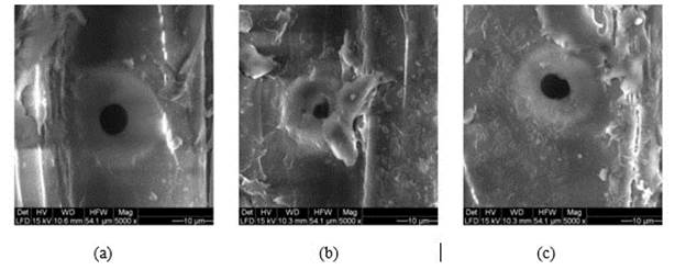 One block from each treatment group prior to leaching was used for microscopic analysis to confirm that extractives were deposited within the wood. Small cut sections were imaged, uncoated, at 15kV and 1 Torr pressure in a FEI Quanta 400F Environmental Scanning Electron Microscope (ESEM). Areas of similar morphology on the radial faces of the sections were selected for imaging.