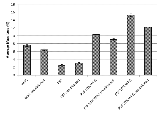 Moisture content was determined for each block and averaged by group. High moisture content (above 25%) confirms conditions were suitable for decay and that the test was viable. Weight loss data was also collected for each block and averaged by sample group. Table 4 contains the average moisture content data as well as the average corrected weight loss data for both leached and non-leached soil block tests.