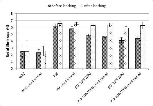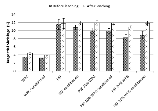 Percent shrinkage values, before and after leaching, are reported in Figure 3 and Figure 4. Post-conditioning did not affect WRC heartwood shrinkage. Radial shrinkage values were similar to the literature value of 2,4% while tangential shrinkage values were slightly lower than the literature value of 5,0% reported by Glass and Zelinka (2010). PSF shrinkage values were higher than the literature values of 4,4% (radial) and 9,2% (tangential) of Glass and Zelinka (2010). Impregnation with WRC extractives to a 10% WPG significantly reduced radial shrinkage by 18 to 21% and tangential shrinkage by 9 to 14% prior to leaching. Impregnation with WRC extractives to a 20% WPG significantly reduced radial shrinkage by 24 to 34% and tangential shrinkage by 18 to 28% prior to leaching. Despite these gains, even the most dimensionally stable treated PSF blocks showed nearly twice the shrinkage of WRC heartwood. Moreover, after leaching, the shrinkage of extract-impregnated samples increased to levels similar to unimpregnated controls. The results indicate that the extract impregnation methods used in this study would not enhance dimensional stability of the wood if exposed to exterior conditions where leaching would occur.