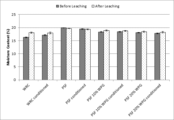 Moisture content following one week of conditioning at high humidity resulted in a moisture content of approximately 20% in PSF controls (Figure 5). Impregnation with WRC was associated with a small reduction in moisture content to approximately 18%. However, this was not as low as the moisture content of 16-17% observed in the WRC reference. After leaching, the moisture content of the WRC heartwood reference increased. This is consistent with previous work on this topic (Stirling and Morris 2006). Moisture content in extractive-impregnated PSF blocks was similar before and after leaching. This suggests that residual extractives were present at least partially within the cell wall where they would affect hygroscopic properties. After leaching and conditioning at high humidity, the PSF samples impregnated with extractives to a 20% weight gain and the WRC heartwood controls reached a similar moisture content.