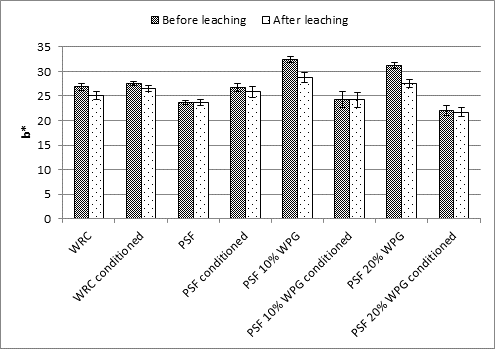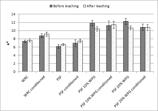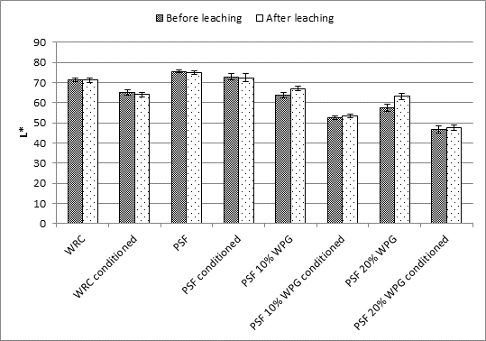 Wood colour was measured before and after leaching (Figure 6, Figure 7 and Figure 8). Extractive impregnation was associated with PSF sapwood becoming darker, less red, and more yellow. In addition, the conditioning step was associated with darkening in all blocks, and reduced yellowing in extractive impregnated blocks. Conditioned blocks had similar colour before and after leaching, while unconditioned, impregnated blocks became lighter, less red, and less yellow. Extractive impregnation was an effective way to give PSF a similar colour to WRC heartwood.
