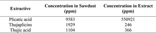 WRC sawdust (approximately 20 kg) was obtained from a cedar sawmill in coastal British Columbia. The mill is a secondary manufacturer of WRC and as such produces relatively dry, clean sawdust with very little bark or dirt. Water extraction was selected because it has a low cost and does not require expensive solvent handling equipment. From this sample, five subsamples, approximately 20 g each, were taken for moisture content determination by oven drying. Average moisture content was 26 % (standard deviation 8 %). Approximately 5,5 kg of sawdust (OD equivalent) was refluxed in distilled water for 3 hours, cooled, and passed through a Buchner filter to remove particulate. Extracts were then reduced by rotary evaporation and freeze dried. Extracts were prepared in seven batches with an average yield of 4,3 % of sawdust mass (standard deviation 0,7 %). Approximately 240 g of extract was obtained in total. Sawdust samples were analyzed for extractives following the methods outlined by Daniels and Russell (2007) (Table 1).