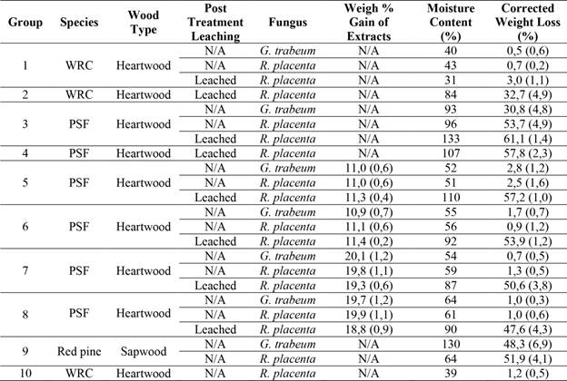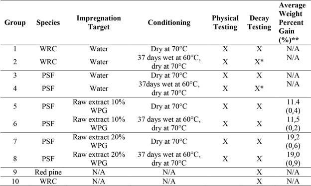 Extracts were reconstituted in hot distilled water and pressure impregnated into the PSF samples using a full cell process, which included a 30 min initial vacuum at -94 kPa, followed by a 1 h press at 414 kPa. Samples were either dried at 70°C following treatment, or conditioned wet at 60°C for 37 days and then dried at 70°C. The wet conditioning was intended to allow further migration and redistribution of active ingredients in the cell walls. Red pine (Pinus resinosa) sapwood samples were included in decay testing as negative controls to assess fungal vigor. WRC heartwood samples were also included in this study as positive controls.