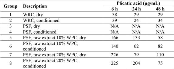 Leachates taken from the first 3 cycles were analyzed for extractives to confirm that mass losses were attributable to loss of WRC extractives. Plicatic acid was present in the WRC heartwood leachates and in impregnated PSF leachates (Table 3). Concentration in the WRC heartwood leachates was similar at each sampling time. Concentration in the leachates from extractive-impregnated blocks was initially much higher than in the WRC heartwood leachates, but decreased substantially in later sampling events. Conditioning did not have a major impact on plicatic acid concentration in the leachates. Concentrations of thujic acid and the thujaplicins were only present in very low quantities and are not reported here.