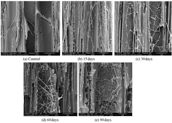 Fungal colonization, as assessed using SEM, followed similar trends to those observed for mass loss. Fungal hyphae were scattered in fibers in blocks exposed to the test fungus for only 15 days and then became increasingly common over the next 75 days (Figure 2). Hyphae were abundant in the vessels, especially after 75 and 90 days of exposure. The results were consistent with the degree of both mass and compressive strength losses.