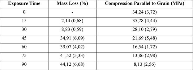 Mass loss averaged 2,14% after 15 days of fungal exposure and steadily increased with incubation time to an average of 44% mass loss after 90 days (Table 1).