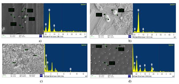 The synthesized CuO nanoparticles (CuO nps) using plant leaf extracts were characterized by SEM coupled with EDAX. SEM image confirmed the presence of CuO nanoparticles that are spherical in nature. The particles were well separated without agglomeration and the particle size remained within a range of 136 nm to 380 nm in the case of CuO nps synthesized using A. indica leaf extract. In the case of CuO nps synthesized using P. pinnata leaf extract and C. reticulata peel extracts the particle sizes were in the range of 466nm to 2 µm and 259 nm to 519 nm respectively. The particle size of CuO nps synthesized using L. camara leaf extract was in the range of 33 nm to 46 nm. EDAX profile also confirmed the presence of copper and oxygen in major fraction (Figure 1).
