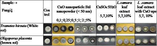 Formulation of copper oxide nanoparticle and Lantana camara leaf extract was found to be effective as a wood protectant against two decay fungi as evidenced by growth test on agar with added test substances. This may be due to the smaller particle size of the CuO nps synthesized using L. camara extract. All the plant extract CuO np formulations are found to give protection against termites in the field for a period of six months and further evaluations are in progress for a better conclusion. Development of a sustainable plant extract based synthesis route for metal nanoparticles enables the possibility of combining the intrinsic property of plant extract and metal nanoparticles for potential application in wood protection. The resultant formulation may protect wood from biodeterioration in a more effective way without any harmful effects to the environment. However, decay tests with impregnated wood samples must follow to prove protecting activity also with wood. In view of a feasible use for wood protection it must be also investigated if the CuO nps fix to the woody cell wall because otherwise only an indoor use will be possible.