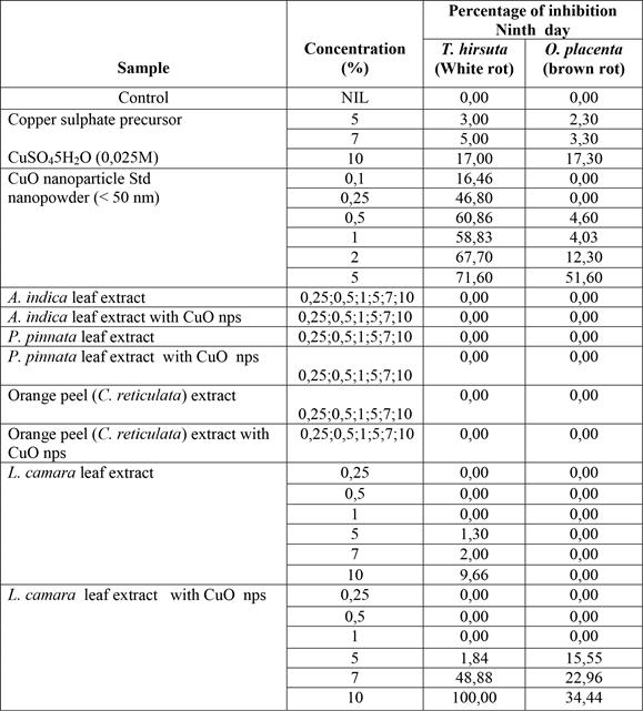 There was no inhibition of fungal growth at concentrations 0,25; 0,5; 1; 5; 7 and 10% in all the plates till the end of the experiment in the case of plates having A. indica, P. pinnata, and orange peel (C. reticulata) extracts. Plates with CuO nanoparticles synthesized using A. indica, P. pinnata and orange peel (C. reticulata) extracts also showed no inhibition at concentrations ranging from 0,25; 0,5; 1; 5; 7 and 10%. Plates containing precursor solution of CuSO4.5H2O showed inhibition of up to 17% at a concentration of 10% which is not significant. L. camara leaf extract exhibited an inhibition of 9,66 % at a concentration of 10% against the white rot fungus T. hirsuta.