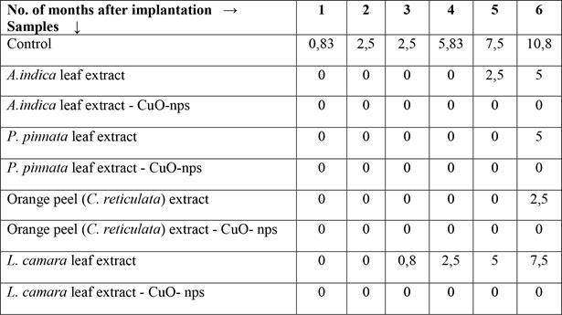 There was no damage to the rubber wood samples treated with the formulation of copper nanoparticles synthesized using all the plant extract after an exposure period of six months in the field. (Table 2). Evaluation is progressing to get a better idea regarding the antitermite activity of the plant extract CuO nps formulation under field conditions.