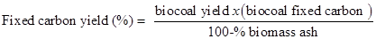 The high heating value of bio-coal was determined using an adiabatic calorimeter bomb IKA300 according to ASTM D240-02 (2007). Proximate analysis of bio-coal was done according to the standards ABNT NBR 8112 (1986) for volatile matter and ASTM D3174-04 (2010) for ash analysis. For these analyzes, charcoal crushed samples were used, which were passed through the 40-mesh sieve and retained in the 60-mesh sieve. Samples were oven dried at 103±2 °C. Fixed carbon yield (%) was calculated to investigate the efficiency of the pyrolysis using Equation 1.