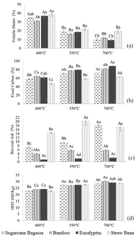Figure 2 shows the average values of the proximate chemical composition (volatile matter, fixed carbon and ash) and high heating value (HHV) of bio-coal due to the final temperature of pyrolysis. The concentration of volatile matter dropped with the increase at the final temperature, except for the straw bean, with temperatures between 550 and 700 °C, which were statistically equal.