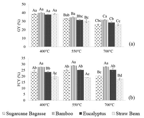 As show in Figure 3, when the final temperature of pyrolysis increases from 400 to 550 °C, a reduction of gravimetric yield was observed. However, it not affects the fixed-carbon yield, once bio-coal fixed carbon increases. Eucalypts fixed-carbon yield rises in the temperature of 550 °C, possibly due to its high lignin content. At the final pyrolysis temperature of 700 °C a reduction of fixed-carbon yield was observed for sugar cane bagasse and straw bean.