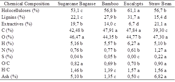 Table 1 shows the chemical composition of the raw biomasses. Eucalyptus contained the highest concentrations of holocelluloses and lignin, and lowest content of extractives and ash. Lowest holocelluloses and lignin were observed to the sugarcane bagasse and straw bean, respectively. Straw bean shows the highest values of the extractives and ash.