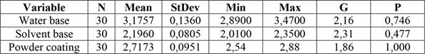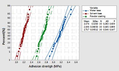 Probability plot of coatings adhesion strength values of for solvent base, water base and powder coating is displayed in (Figure 1). This plot was presented with results of mean, standard deviation (StDev), sample size (N), Andersen darling test (AD) and P-critical values. According to the results of 95% confidence level, P-values were high than 0,05 showing the model the observations have a normal distribution. Water-based, powder coating and solvent-based mean values for adhesion strength were found as 3,176; 2,717 and 2,196 MPa respectively.