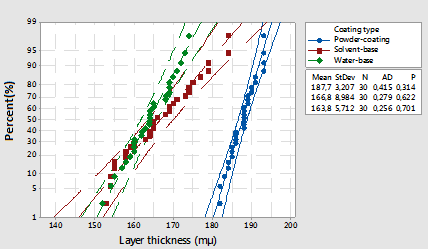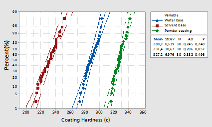 Probability plot of coatings hardness values of for solvent base, water base and powder coating is displayed in (Figure 2). Powder coating, water-based and solvent-based mean values for coating hardness were found as 327,2; 288,7 and 231,4; respectively. In (Figure 3), powder coating, water-based and solvent-based mean values for coating layer thickness values were found as 187,7; 166,8 and 163,8 mµ respectively.
