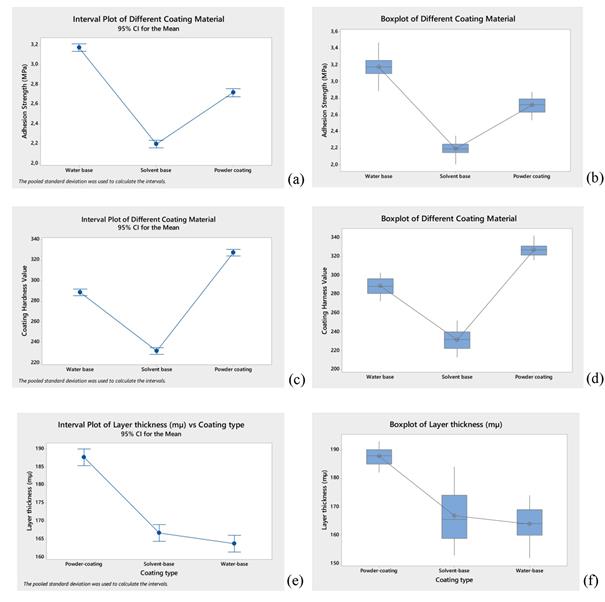 The box plot is a standardized way of displaying the distribution of data based on the five number summary: minimum, first quartile, median, third quartile, and maximum. The interval plot shows a 95% confidence interval for the mean of each group. From the (Figure 4a and Figure 4b), water-based adhesion strength value was higher than solvent-based and powder coating values. In the (Figure 4c and Figure 4d), powder coating surface hardness value was higher than solvent-based and water-based coatings. In the (Figure 4e and Figure 4f), powder coating layer thickness value was higher than solvent-based and water-based coatings.
