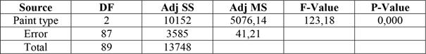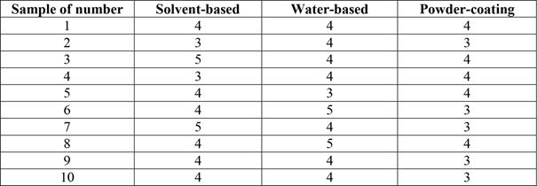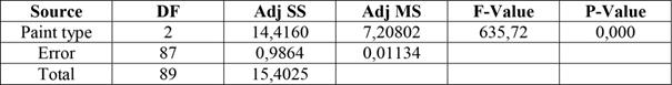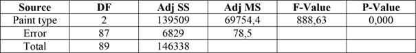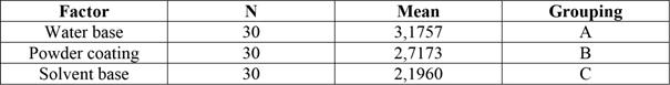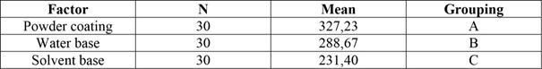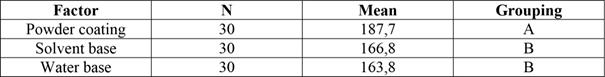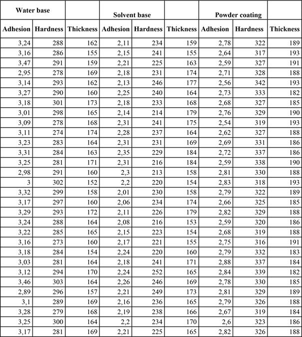 The results of adhesion strength, layer thickness and coating hardness for solvent base, water base and powder coating are given in the (Table 1). For each type of coating types, 30 x 3 arrays were measured and these results were evaluated with ANOVA analysis. In order to reduce the variation during measurement, the measurements were performed in a random order for determining the coating performance.