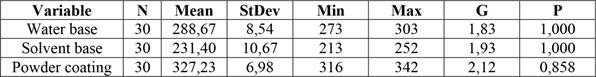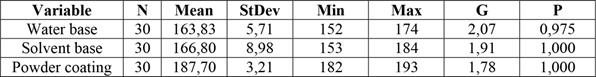 In this study, in order to determine the quality characteristics of adhesion strength, coating hardness, layer thickness and impact deformation test, (30x3) measurements were taken for each quality characteristic. The Anderson-Darling test is used to test if a sample of data came from a population with a specific distribution. Grubb’s method was used to determine the outlier analyzes. This test detects outliers from normal distributions. The test can detect one outlier at a time with different probabilities from a data set with assumed normal distribution. Analysis of variance and Tukey’s test were applied to evaluate the effective parameters.