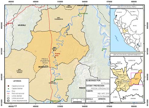 La madera de árboles de Guazuma crinita Mart. proviene de plantaciones forestales de la Empresa Reforestadora Amazónica S.A.; sector Maquizapallo localizada en la ciudad de Puerto Inca, Huánuco - Perú; ubicada geográficamente a 9° 37’ 43’’, latitud S y 74° 58’ 28’’ longitud W; 145 m de altitud (Figura 1). La zona tiene una precipitación media anual de 2482 mm y temperatura mínima de 22 °C y máxima de 35 °C. Los suelos de la plantación son de tipo aluvial de textura franco y franco-limoso; pH 5,5, con contenido de materia orgánica 4%; CIC 10,8 meq/100 g y profundidad efectiva mayor a 90 cm. Las muestras de madera fueron colectadas en campo en noviembre del 2016. El espaciamiento de los árboles en la plantación fue de 3 m x 3 m.