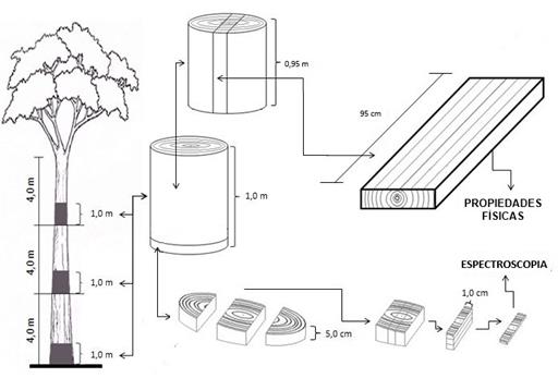 Los arboles al momento del corte tenían cinco años (63 meses) y ocho años (103 meses). Se seleccionaron cinco árboles por edad; se midió la altura comercial, tumbados y divididos en tres partes (basal, media y apical) conforme a la metodología utilizada por Valente et al. (2013). Se tomó un metro de la parte inferior de cada troza de cada nivel y de cada una de ellas se obtuvo una rodaja de 5 cm de espesor, de donde se obtuvieron muestras diametrales de 2 mm de espesor y 2 cm de ancho para su evaluación por espectroscopia. De lo restante se obtuvo una porción central de 5 cm de espesor para la obtención de probetas para la determinación de las propiedades físicas; conforme a la Figura 2.