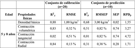 Buenas correlaciones por NIR fueron obtenidas para los modelos desarrollados para densidad básica y contracción volumétrica para ambas edades; en tanto, que la contracción tangencial y radial no proporciona buena predicción.