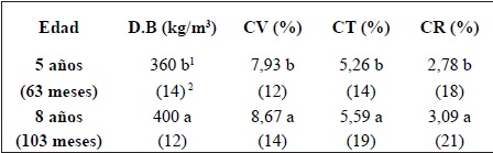 La densidad básica promedio obtenida para las edades de 5 y 8 años fue de 360 y 400 kg/m3 respectivamente, lo que permite clasificarla como madera de baja densidad.