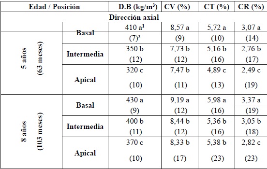 La densidad básica, contracción volumétrica, tangencial y radial son mayores para la edad de 8 años y axialmente disminuyen de la base al ápice del árbol para ambas edades con variaciones estadísticas significativas.