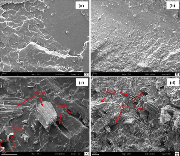 SEM images of the PLA-chitosan composites for 5% chitosan (a) and 10% chitosan (b), and the blends with 10% wood flour (c), 20% wood flour (d) were given in Figure 1.