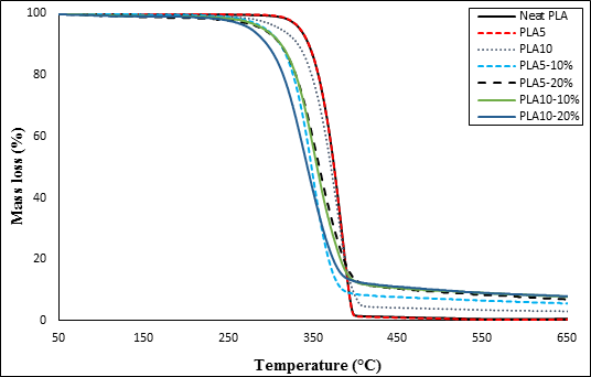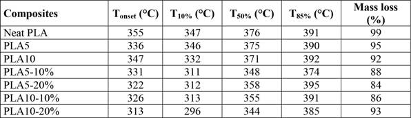 As seen as Table 3, Tonset, T10%, T50%, T85% of the PLA-chitosan composites decreased with the addition of both chitosan and wood flour. Thermal stability of the biopolymer blends was determined to be better than the PLA-chitosan composites with wood flour. The maximum and minimum temperature for T50% were determined as 344°C for 10% chitosan-PLA blends with 20% wood flour and 376°C for neat PLA, respectively. The mass loss of the PLA-chitosan composites was found to decrease from 99% for neat PLA to 84% for 5% chitosan-PLA blends with 20% wood flour. The thermal decomposition temperature (Tonset, T10%, T50%, T85%) and mass losses of the PLA-chitosan blends were found to be lower than the neat PLA matrix. As a result, it can be said that both chitosan and wood flour decreased the thermal stability of the neat PLA. In a study, Bonilla et al. (2015) found that the incorporation of chitosan did not promote significant changes in the thermal behavior of neat PLA. The similar results were obtained by Quiroz-Castillo et al. (2015).