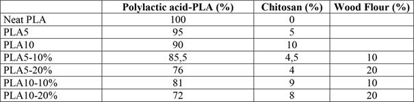 Biopolymers and wood flour were blended with speed mixer and then the blends were compounded using a twin screw extruder with 16 mm screw diameter and L/D ratio of 20 (Aysa Instruments, Turkey). Rotor speed and process temperature was set at 65 rpm and 165°C, respectively. The extruded blends were passed across a water bath and they was pelletized. The extruded blends were ground in a grinder (Aysa Instruments, Turkey), and then the pellets dried to 24 hours before compression molding. The temperature used for compressing molding, the compression pressure and pressure duration was 175 °C, 25 bars, and 5 min, respectively. Three panels with dimension of 20 x 20 x 3 mm3 for each formulation were produced with the compression molding, and mechanical test samples were obtained with cutting of the panels according to the related standards in the characterization section. The mechanical samples were prepared with sizing of the panels by a saw cutter. Ten replicates for the mechanical testing of all formulation were prepared. Experimental design of the PLA-chitosan blends and their composites with wood flour is shown in Table 1.