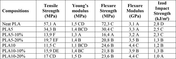 The effects of wood flour on the mechanical properties of polylactic acid-chitosan biopolymer blends were investigated, and according to the obtained results (one-way ANOVA and Duncan test), the changes in both in groups and among the groups were found to be statistically significant. Table 2 shows mechanical properties such as tensile strength, young’s modulus, flexure strength, flexure modulus, and izod impact strength of the all composites. The addition of chitosan to PLA matrix reduced the tensile strength from 57,1 MPa for neat PLA to 34,3 MPa for 5% chitosan and 11,5 MPa for 10% chitosan, and the flexure strength from 72,3 MPa to 30,4 MPa for 5% chitosan, 24,6 MPa for 10% chitosan. Therefore; it can be said that chitosan has to be a negative effect on the mechanical properties of neat PLA. The addition of wood flour was found to generally decrease the mechanical properties of PLA-chitosan blends. When loadings of wood flour were raised from 10% to 20%, the tensile strength of chitosan-PLA blends increased to the composites with both 5% and 10% chitosan. However; both the tensile strength of all the PLA-chitosan composites with wood flour were found to be lower as comparison with neat PLA. The change trend in the young’s modulus was found to be similar as compare with the tensile strength expect for 10% chitosan-PLA blends with 20% wood flour. The young’s modulus of 10% chitosan-PLA biopolymer composites increased as 3,3% with 20% wood flour, and the young’s modulus of the other all composites decreased, and the largest decrease ratio was found to be 22,6%. As results, the addition of the chitosan effected more the tensile strength as compare with young’s modulus.