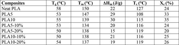 DSC analysis of the samples was performed using a Perkin Elmer 6000 analyzer on samples of about 5 mg. For all specimens, testing was adopted heat/cool methods. All samples were heated to 25oC to 300oC at a ramp rate 10oC/min and cooled with same ramp. Melting temperature (Tm ), crystallization temperature (Tc ), glass transition temperature (Tg ), glass transition enthalpy (ΔHg ), melting enthalpy (ΔHm ), crystallization enthalpy (ΔHc ), crystallinity (Xc ) of the materials was determined from thermograms.