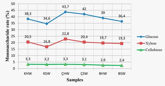 The sugar analysis of the oleaster wood samples was determined according to the NREL method (Laboratory Analytical Procedures (LAP) from the National Renewable Energy Laboratory) (Sluiter et al. 2008). Prior to the high performance liquid chromatography (HPLC) sugar analysis, acid hydrolysates containing monosaccharides were brought to pH 7 level with calcium carbonate so that the pH-gradient column was not damaged. The HPLC analyses were performed with an Agilent 1200 system and a refractive index detector (RID) connected to this system. The injection volume was applied as 20 μL; 5M H2SO4 was used as the mobile phase and the flow rate was determined to be 0,5/min. A Shodex SH1011 No: H810110 column at a temperature of 60 °C was used to carry out the chromatographic separation of the sugars (cellobiose, glucose and xylose).