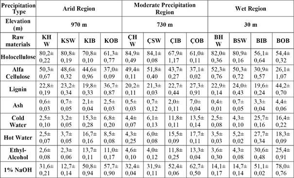 As shown in Table 2, the highest amount (84,9%) of holocellulose was found in the oleaster wood samples from the Çankiri region, while the highest amounts of alpha cellulose (52,3%) and lignin (24,0%) were found in the wood samples taken from the Balikesir region, which is a wet precipitation zone. All the solubility values of the wood samples taken from the Çankiri region, including that of the 1% NaOH, were found to be the highest.