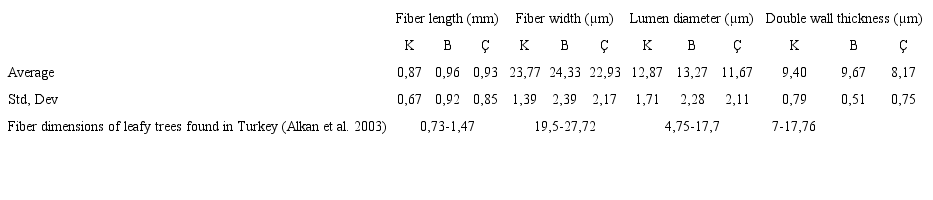Table 3 shows that, although the oleaster tree wood fiber length, fiber width, lumen diameter and double wall thickness were highest in the samples taken from the Balikesir region, the differences among the regions were not significant. All data for fiber morphology were obtained from Alkan et al. (2003), who found that “some morphological tree angiospermae taxa in Turkey are among the data obtained in the study of fiber morphology.” According to the data obtained, oleaster tree wood displays average lumen diameters and short, thin-walled fibers.
