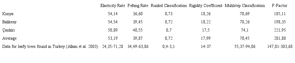 Fibers with an elasticity ratio of 50-75 are considered flexible fibers and are important for papermaking (Kirci 2000). According to Table 4, the average elasticity ratio of the oleaster tree wood is 53,19 which is very suitable for paper production. A high felting ratio of 70% indicates that the paper strength and resistance to tearing, breaking and double folding will be high (Kirci 2000, Bektaş et al. 1999, Akgül and Tozluoğlu 2009). The average felting rate of the oleaster tree wood was found to be 39,87 signifying that the resistance values of the paper to be obtained would be low. The Runkel classification was an average of 0,72 and this low value of less than 1 is a sign that the fibers are thin-walled and would be considered suitable for paper production (Bostanci 1980). A high value for the coefficient of rigidity affects the tearing, breaking and double-folding resistance of the paper in a negative way. The rigidity coefficient of the oleaster wood was 17,99 which was determined to be within the rigidity coefficient values of the leafy trees in Turkey. The Muhlstep classification gives information about the physical properties of paper. The oleaster Muhlstep classification was found to be 70,45 on average and was determined to be within the Muhlstep classification values of the leafy trees in Turkey. The low Runkel ratio of less than 1 indicated that the oleaster tree fibers were thin-walled, making it possible to reach desired physical property values for the paper to be produced. The F-factor indicates the flexibility of the paper to be produced. The F-factor of oleaster tree wood was found to be 201,80 which is within the F-factor values of the leafy trees in Turkey.