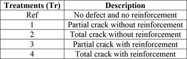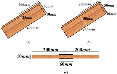 In one face of the test specimens (50 × 400 × 10 mm) it was created a 2- mm- thick and deep cracks and 25 mm (50% width - Figure 2a) and 50mm (100% width - Figure 2b), simulating defects in the wood and inducing the beginning of crack propagation near the midpoint. Ten (10) specimens with no defects (reference) and 10 specimens were prepared for each crack length (25 and 50mm) with and without the reinforcement (60mm length × 50mm width) by the laminated composite fixed on both sides (Figure 2c), resulting in five distinct experimental treatments (Tr) (Table 1) and a total of 50 test specimens in all for the tensile tests.