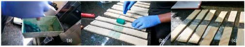 The fibers were cut 6 cm long (Figure 2c) and 5 cm wide (coincident with the width of the specimens), resulting in a bonding area of 0,003 m². Two pieces of carbon fiber (6 × 5 cm) were glued on each face and in the central region of the fissured specimens. It was used 70% by mass of the bicomponent resin in relation to the mass of the fabrics in fixed carbon fibers, as performed by Ferreira et al. (2014).