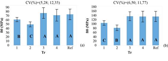 The mean value and coefficient of variation (CV) of the apparent density (ρap) for the Pinus elliotti var elliotti and Manilkara huberi woods were ρap = 542,63 kg/m³ and CV = 6,23% and ρap = 953,22 kg/m³ and CV = 8,57%, respectively. Figure 5 shows the mean values, extreme coefficient of variation (CV) values, mean confidence intervals (at 95% confidence level) and Tukey test results (5% significance) for tension parallel to the fibers (ft0) of the five experimental treatments (Tr) and for the two evaluated wood species.