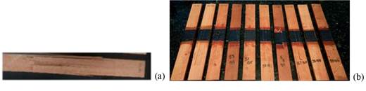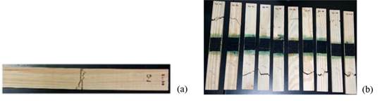 In Figure 6 are presented fully cracked, reinforced (Tr 4) and non (Tr 2) reinforced test specimens after the tensile tests were performed parallel to the fibers of Pinus elliotti.